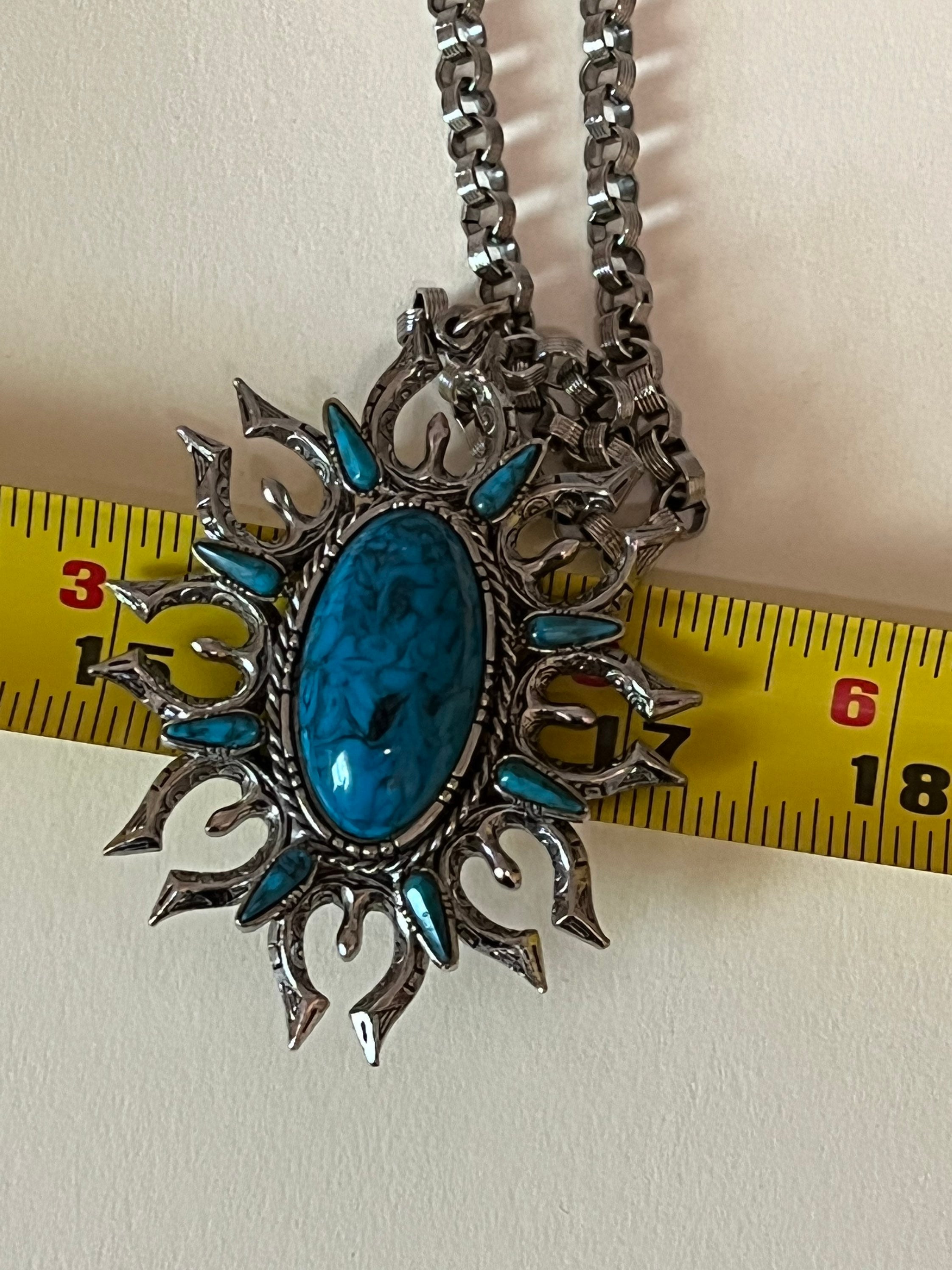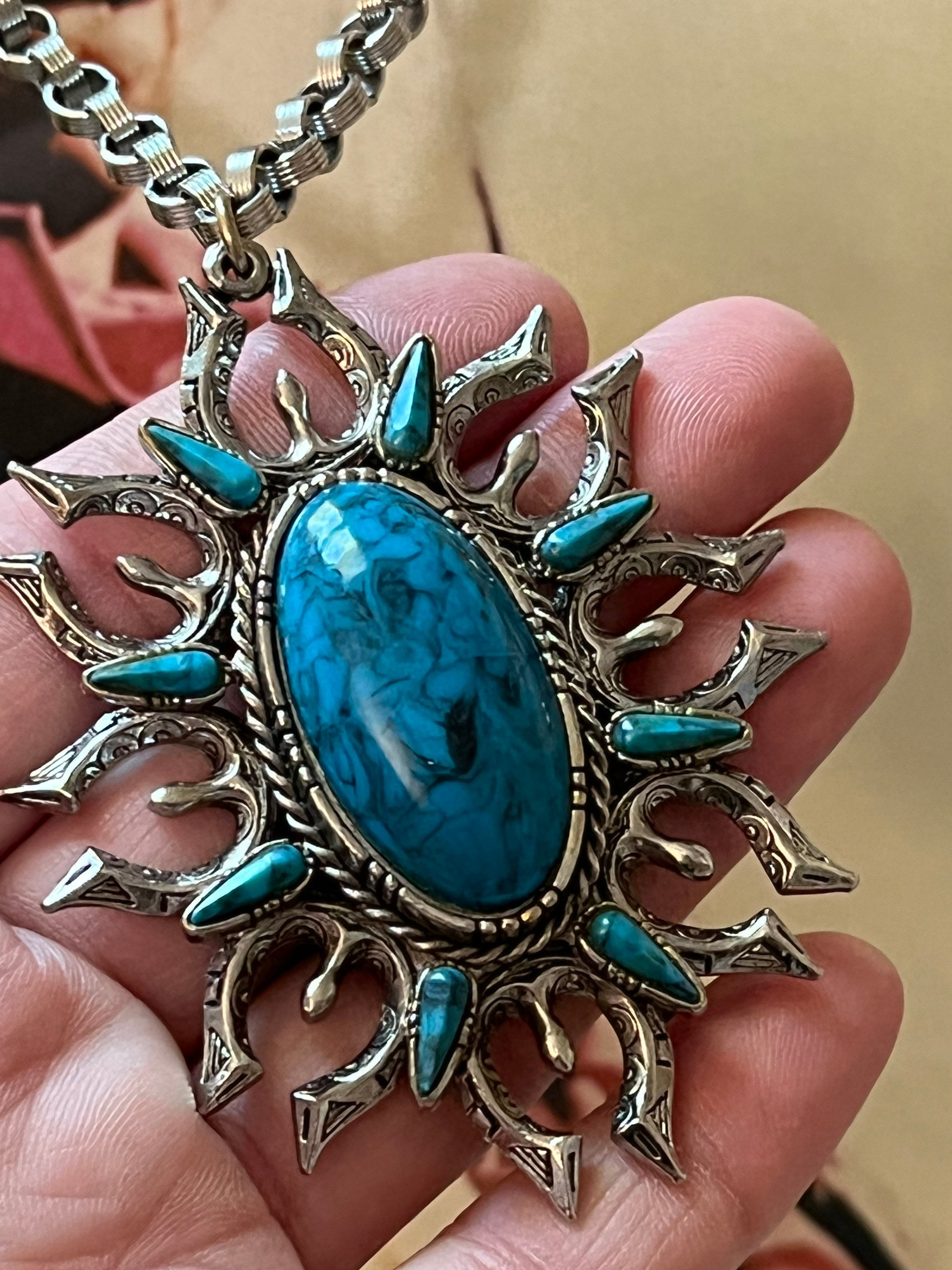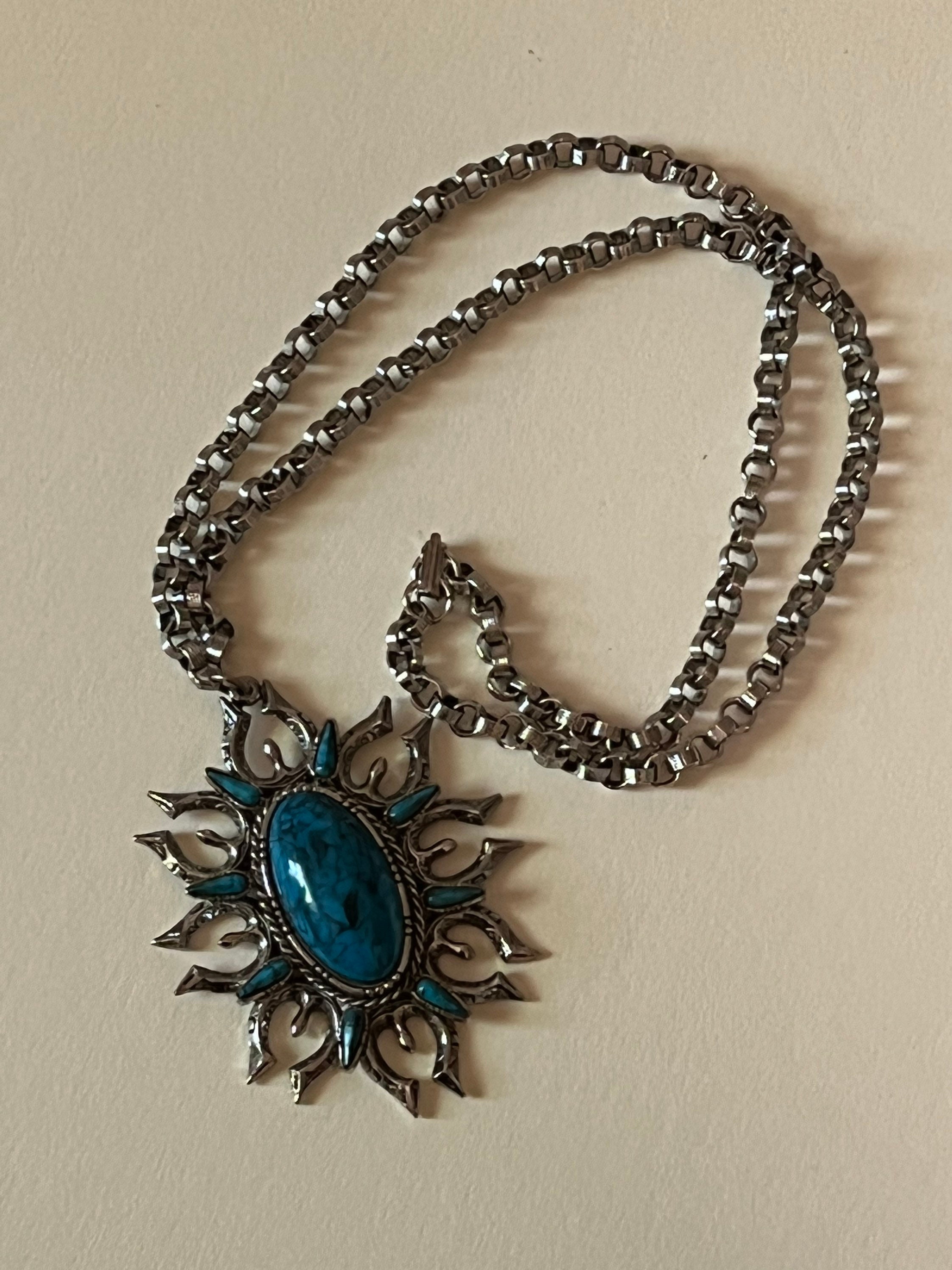 Vintage ART Design 1970 Faux Turquoise Squash Blossom Naja on 24 inch SilverTone 24 inch Chunky Chain