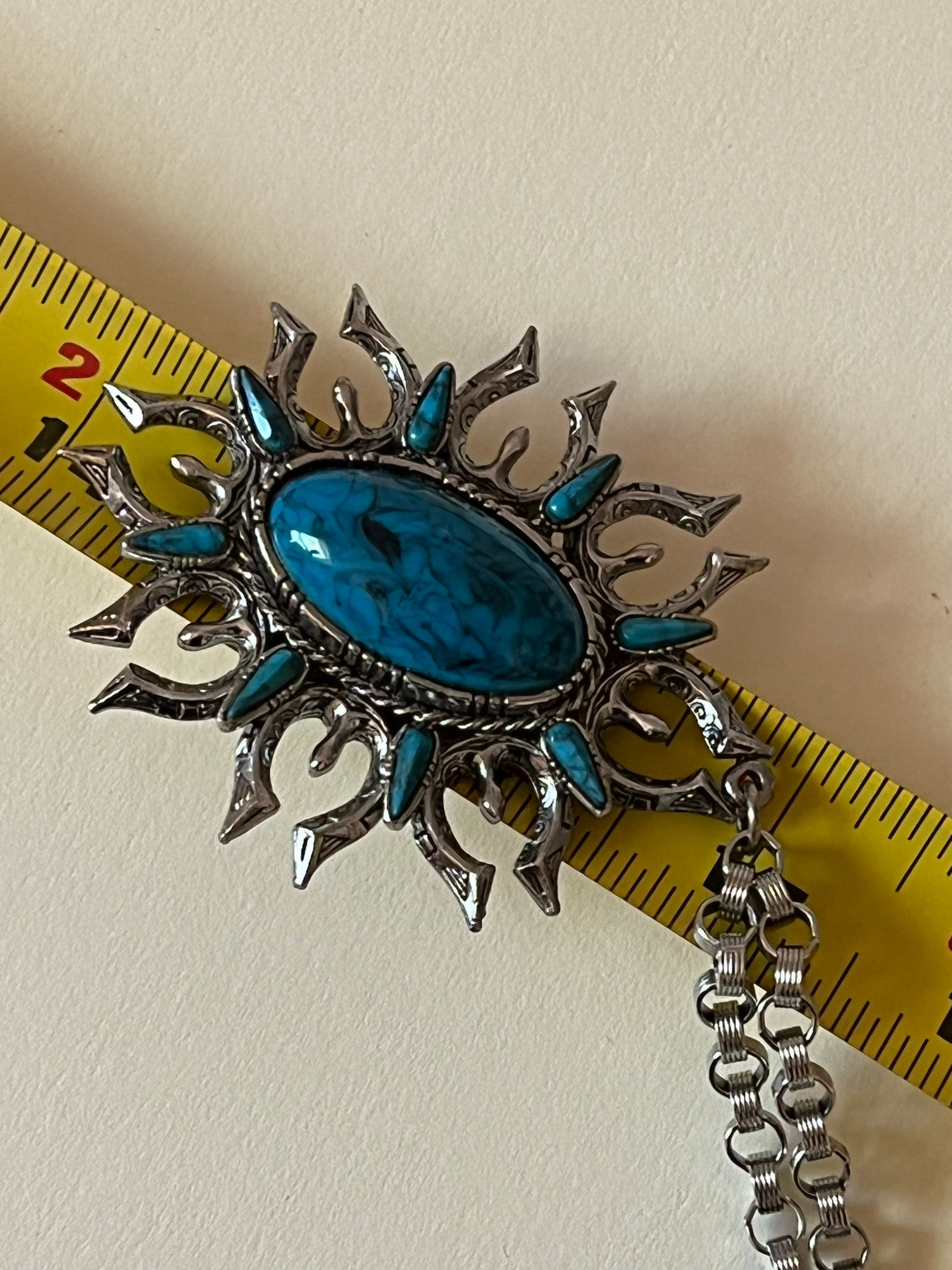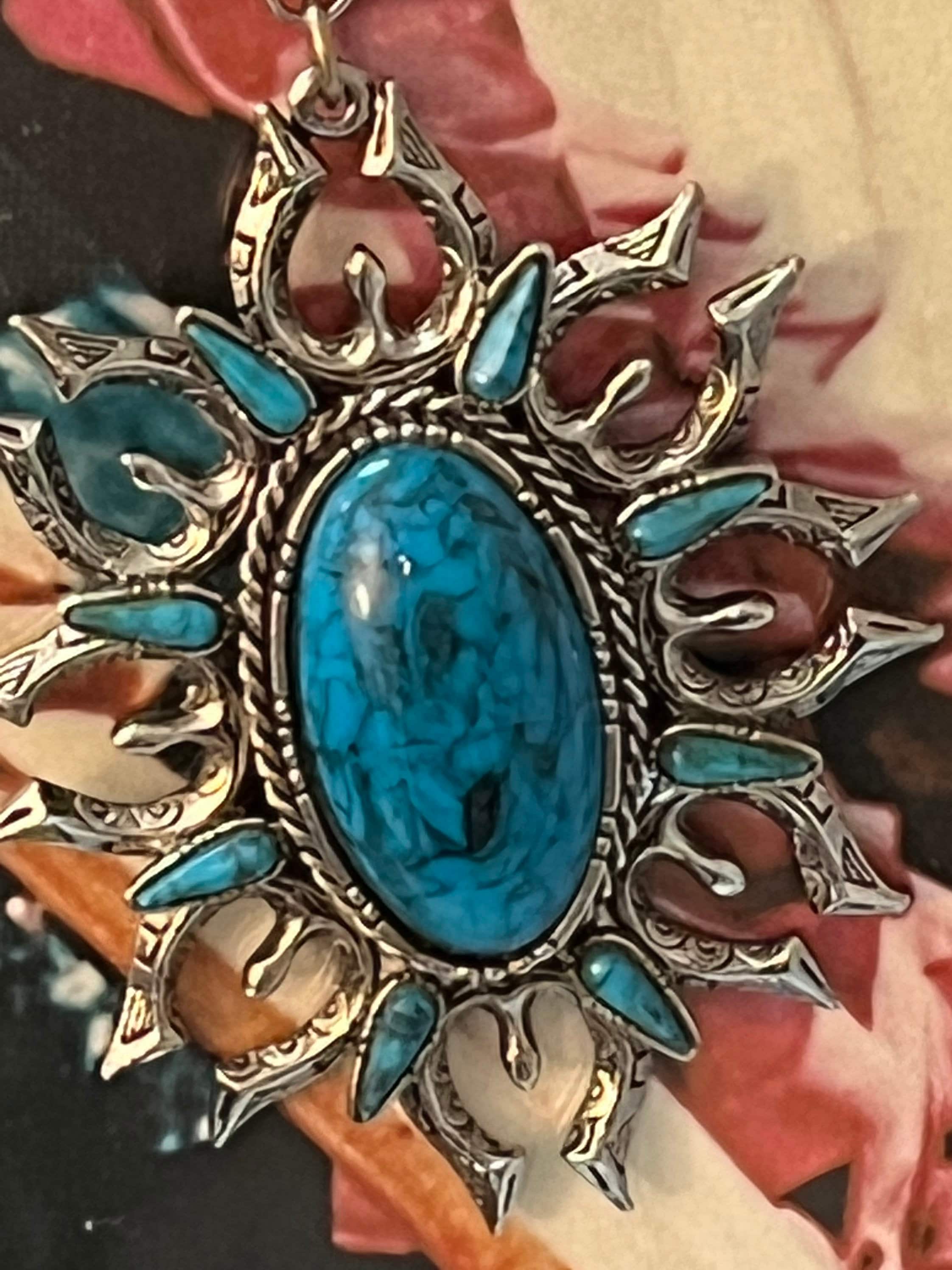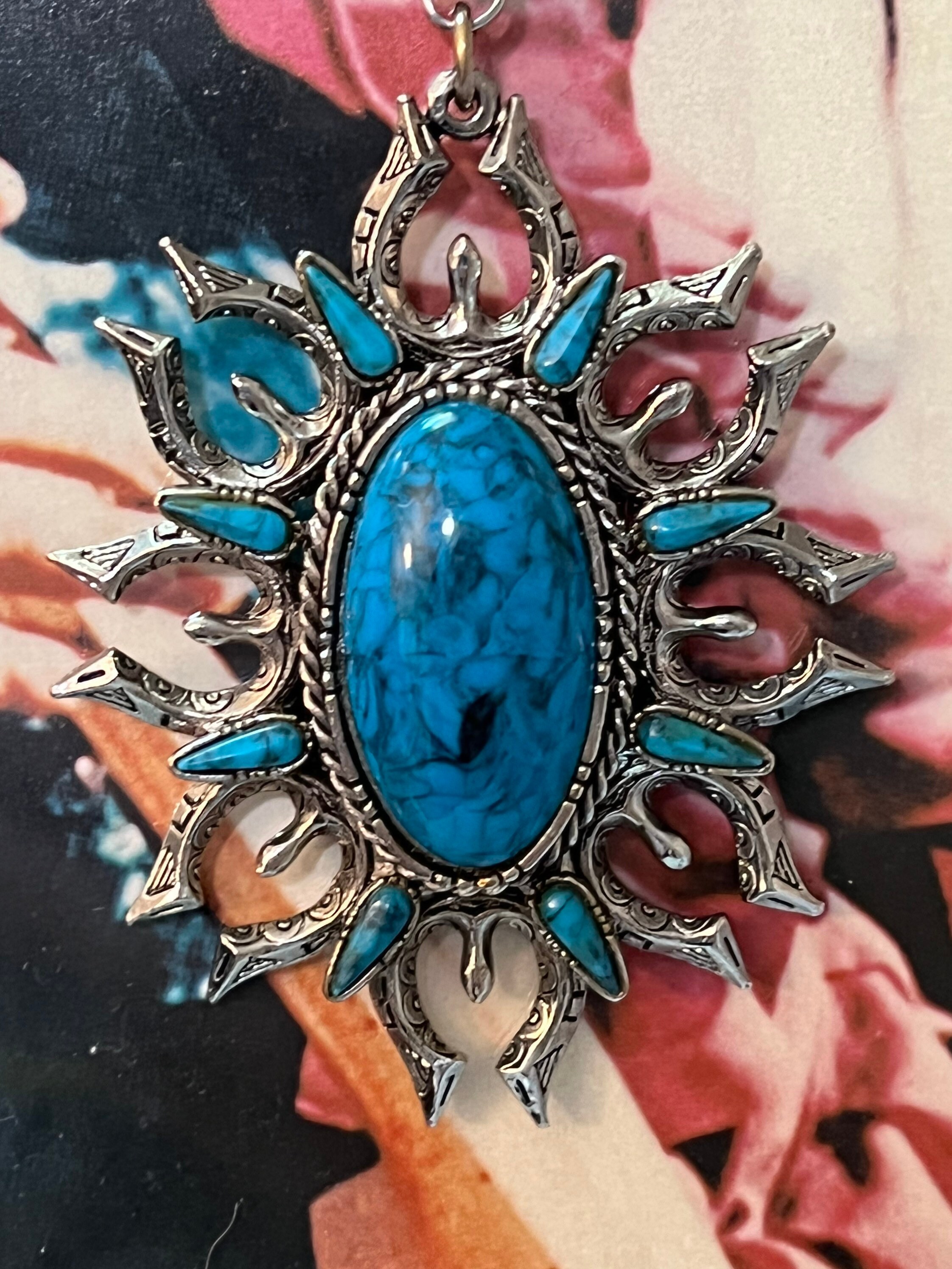 Vintage ART Design 1970 Faux Turquoise Squash Blossom Naja on 24 inch SilverTone 24 inch Chunky Chain