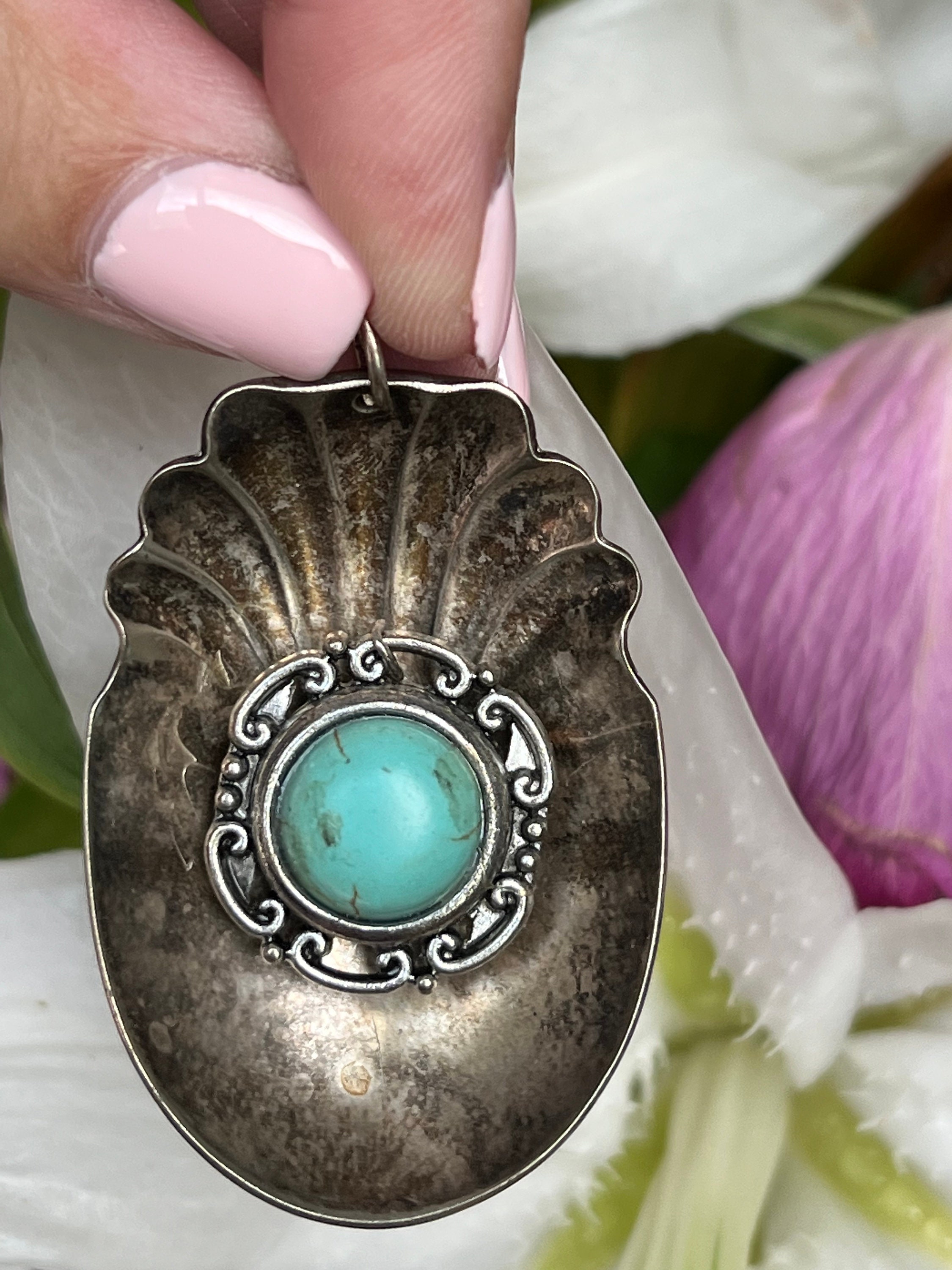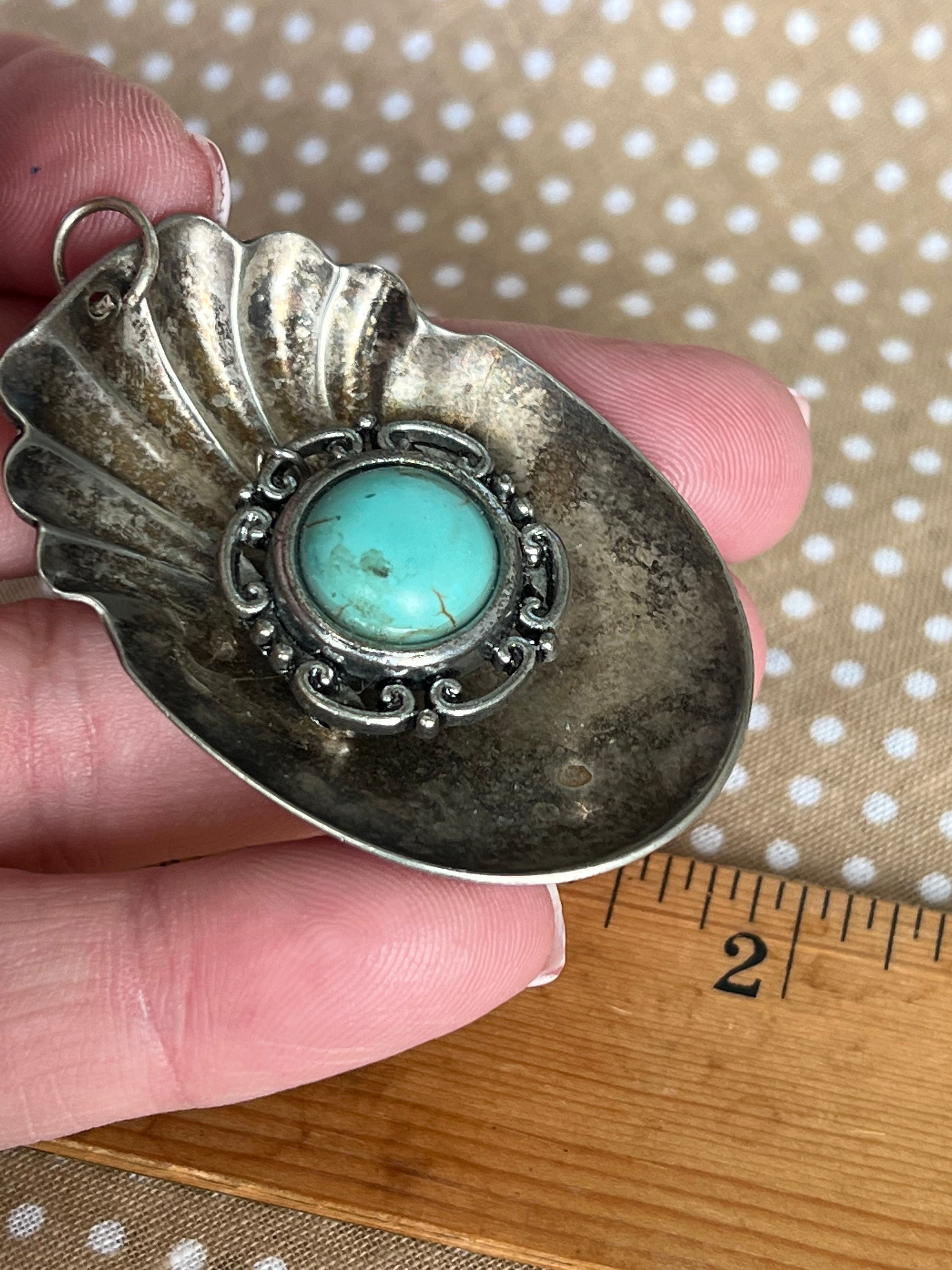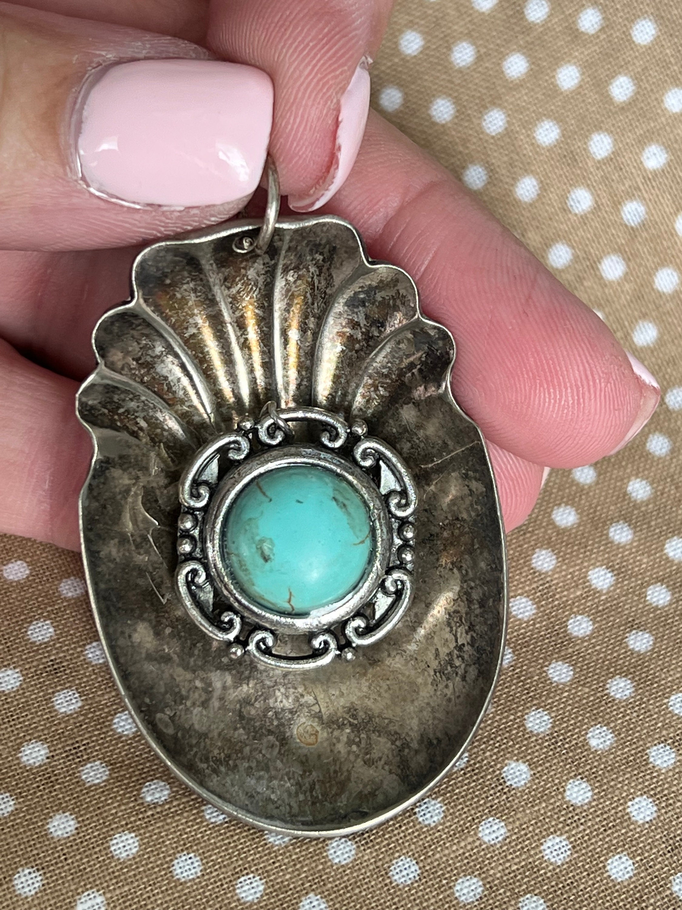 Repurposed Vintage Silver Plate Spoon Pendant with Faux Turquoise Flower Accent 2.25 Inch