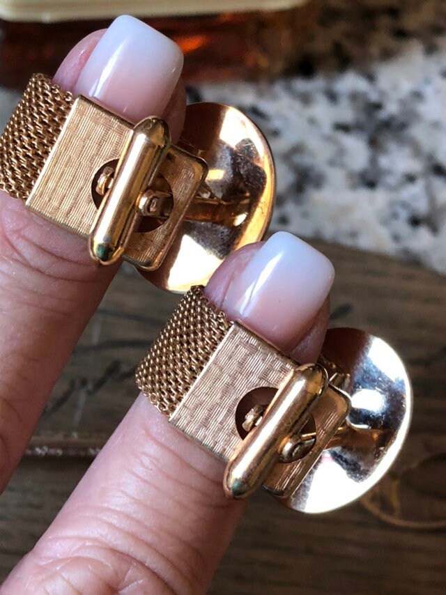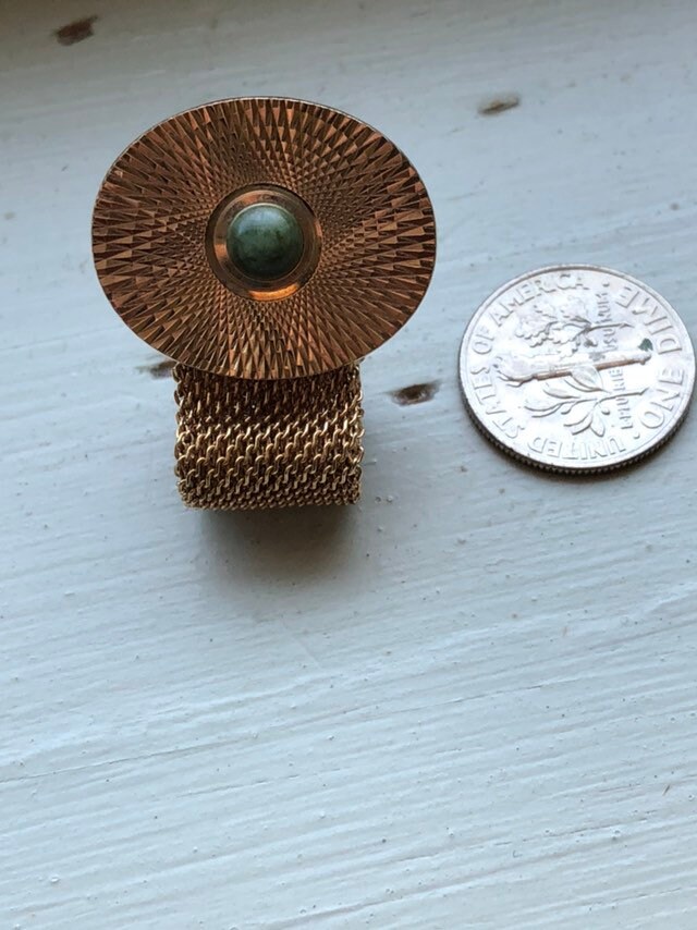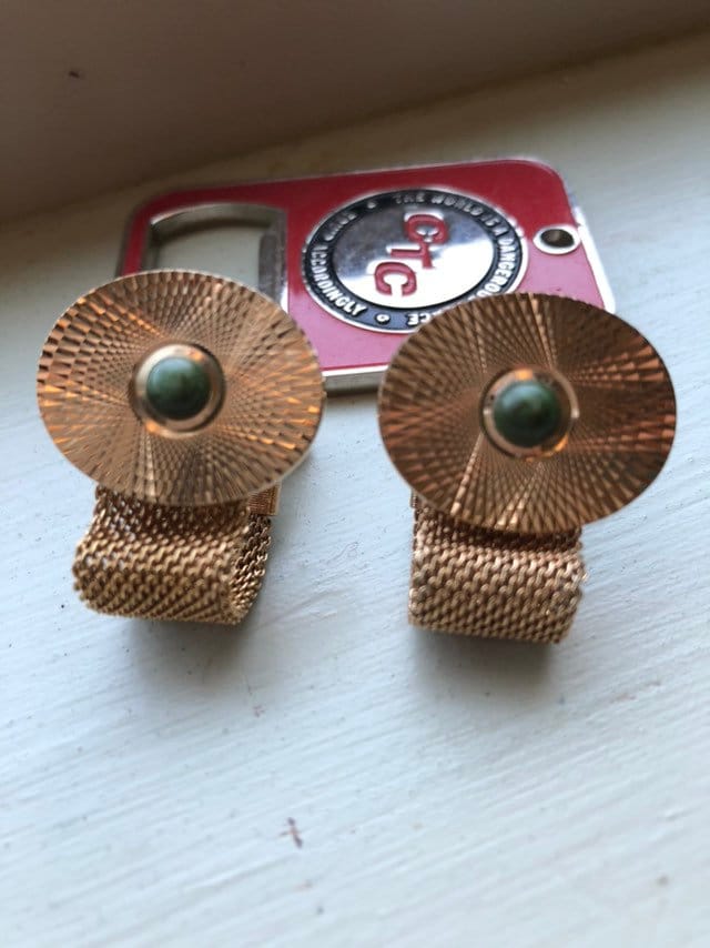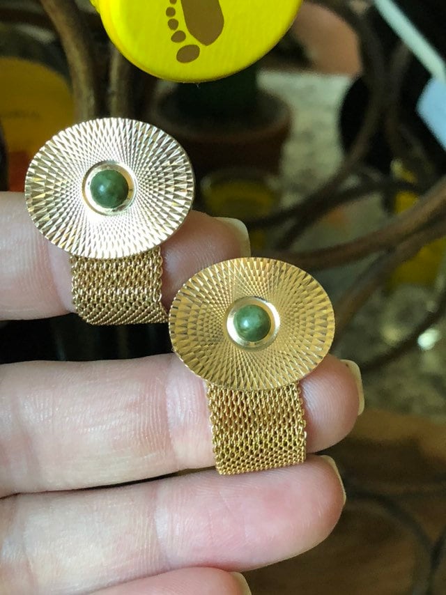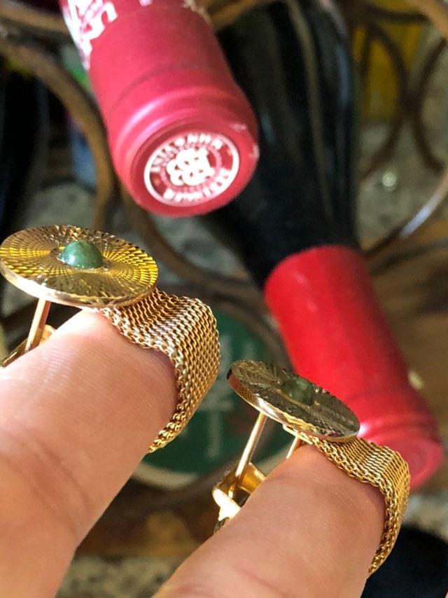 Vintage Gold Tone Mesh with Green Stone Cufflinks Circa 1980 7/8 inch Oval