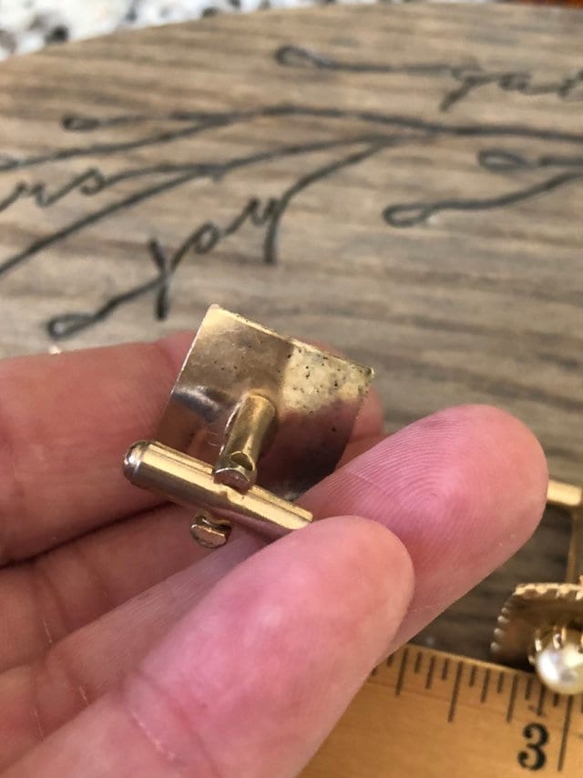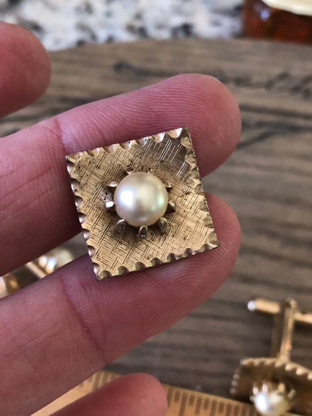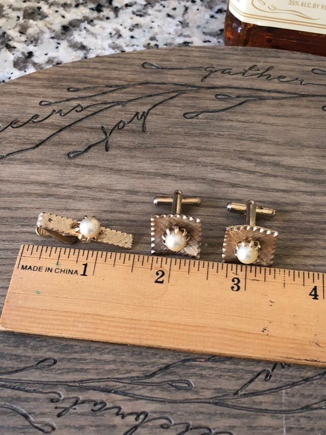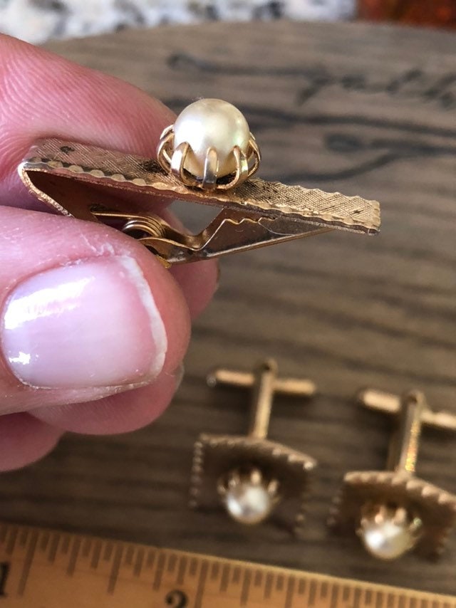 Vintage Gold Tone and Faux Pearl Cufflink and Tie Clip Set