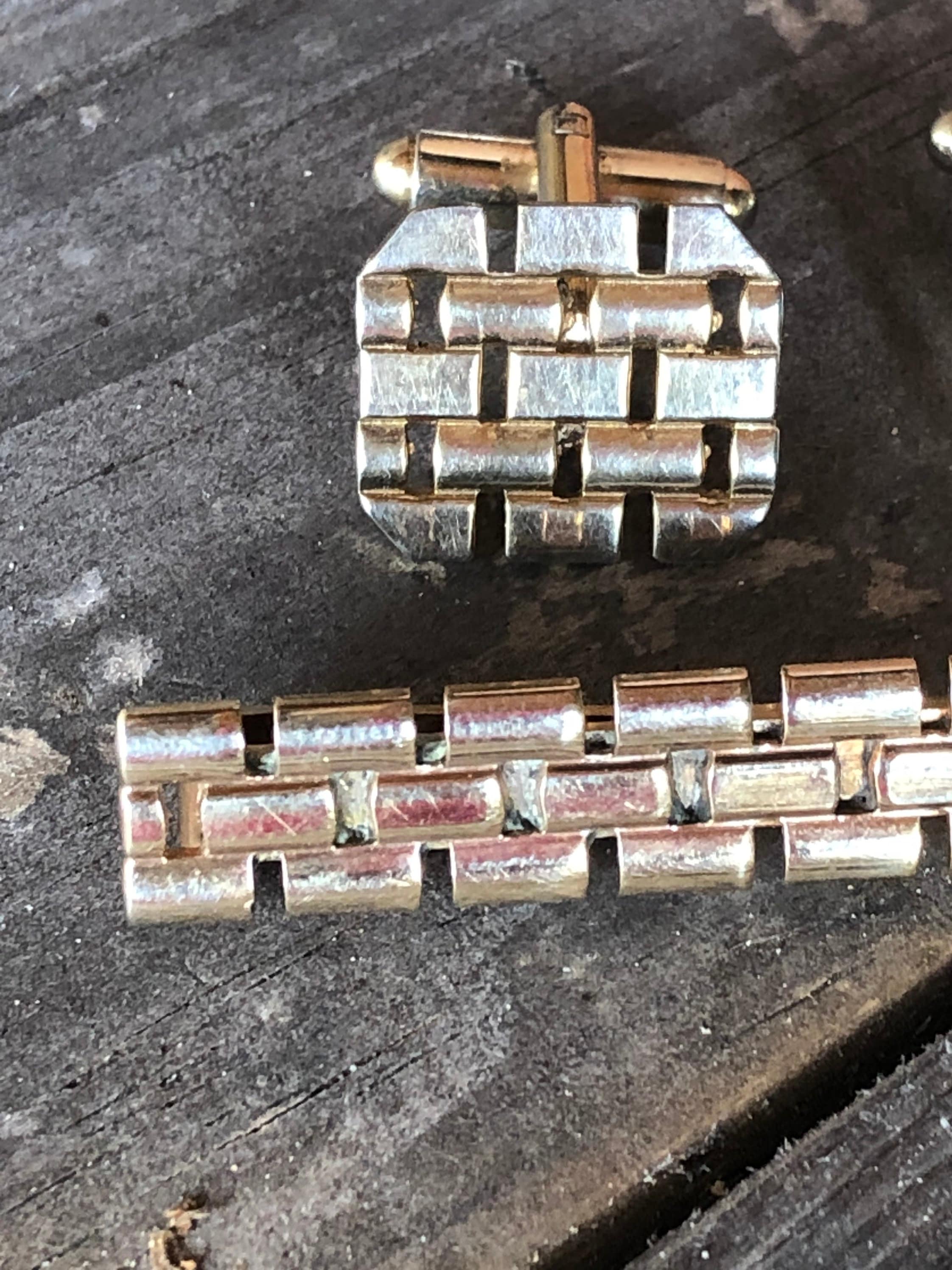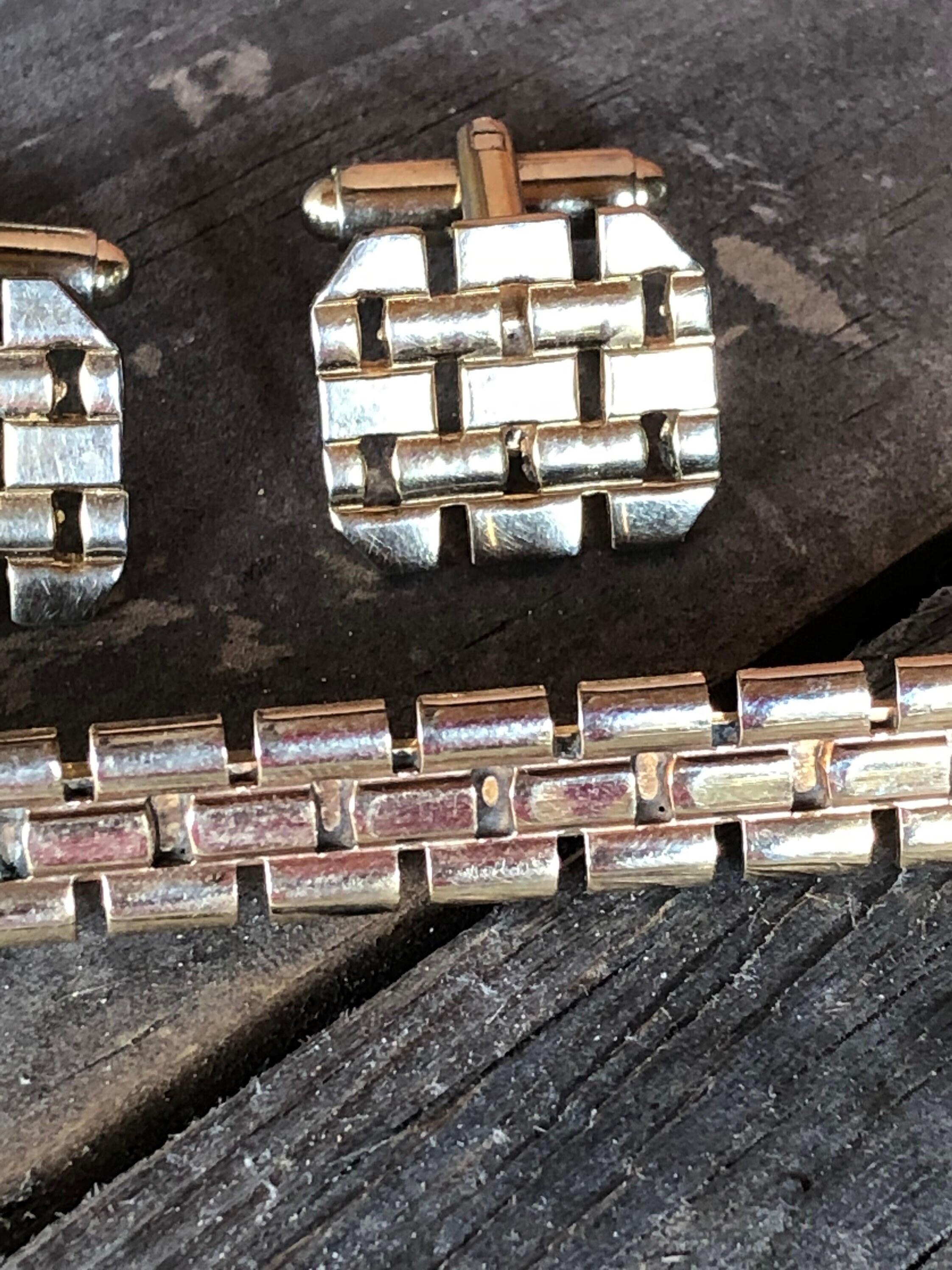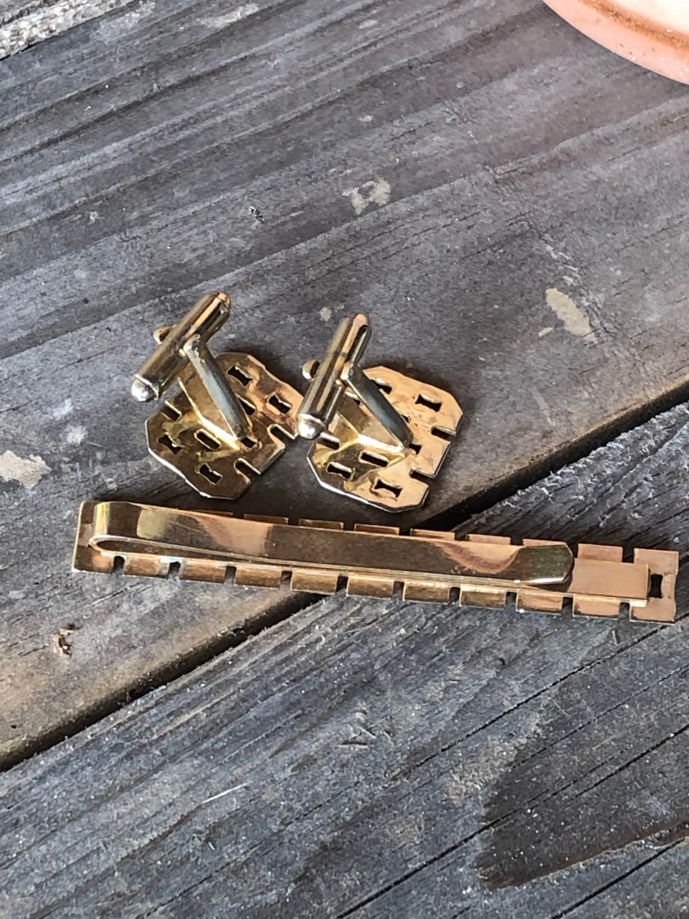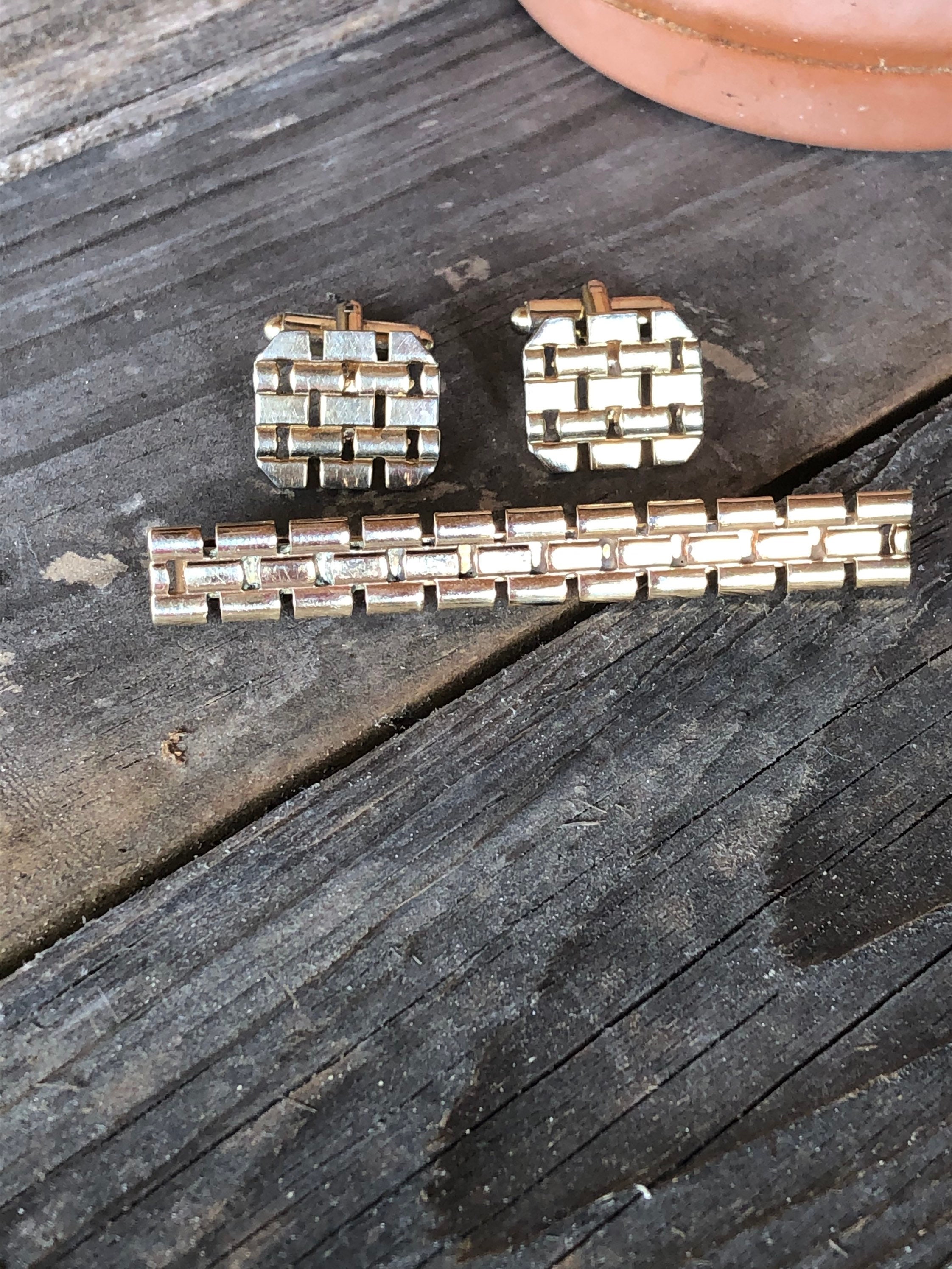 Vintage Woven Gold Tone Cufflinks and Tie Bar Set